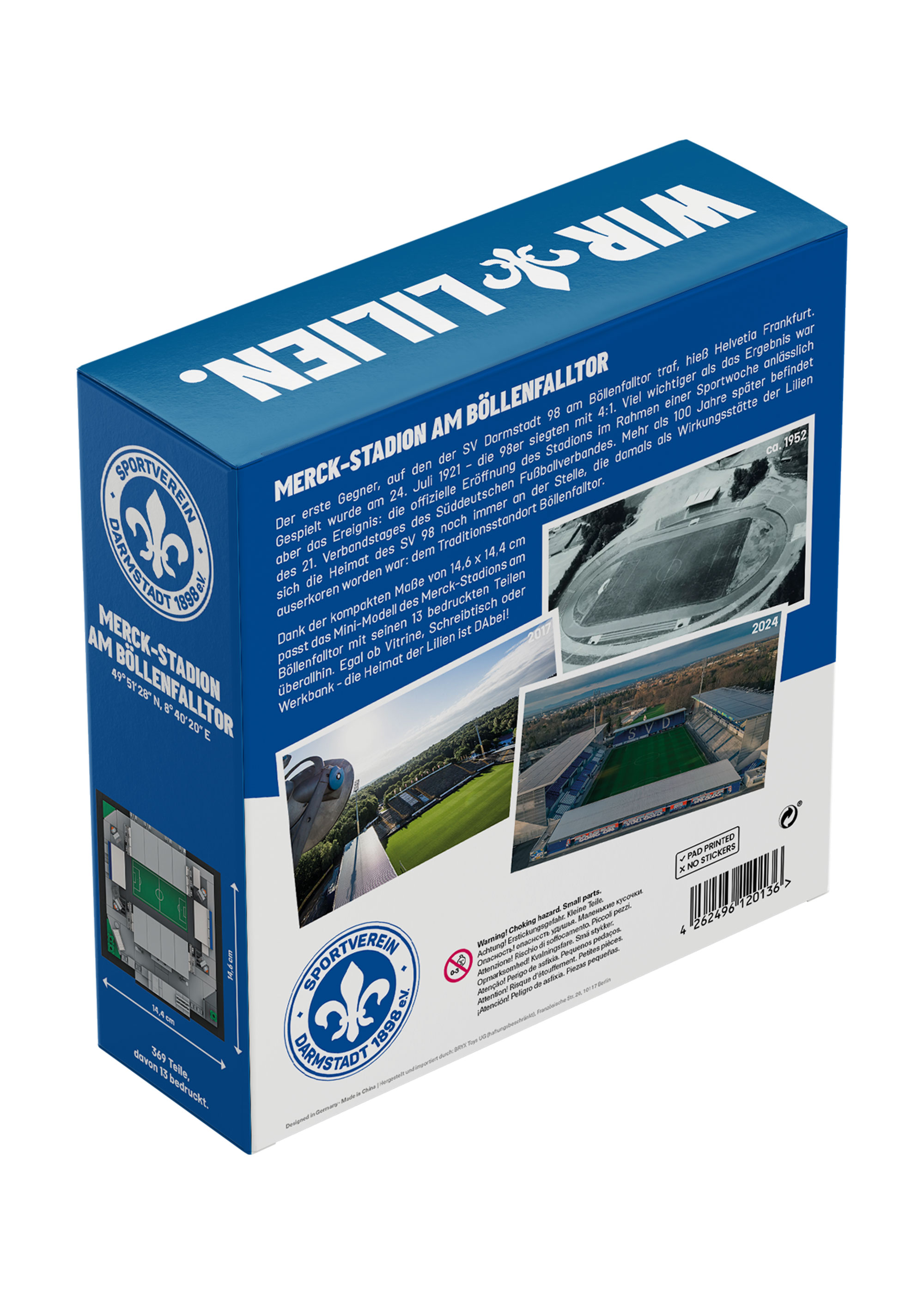 Mit dem BRYX Stadion-Bausatz holst du dir dieses besondere Stück Lilien-Tradition direkt nach Hause. Aus 369 Bauteilen entsteht ein detailreiches Miniatur-Modell des Merck-Stadions am Böllenfalltor – inklusive Tribünen, Flutlichtmasten und vielen liebevollen Details. Das fertige Modell misst ca. 15,0 x 14,4 x 5,9 cm und passt perfekt auf Schreibtisch, Regal oder in die Fan-Vitrine. Das Set verfügt über keine Aufkleber - alle Details sind mit Prints umgesetzt!