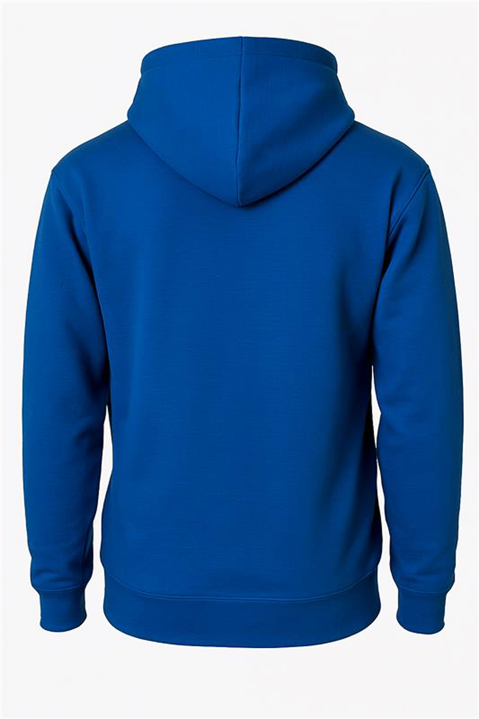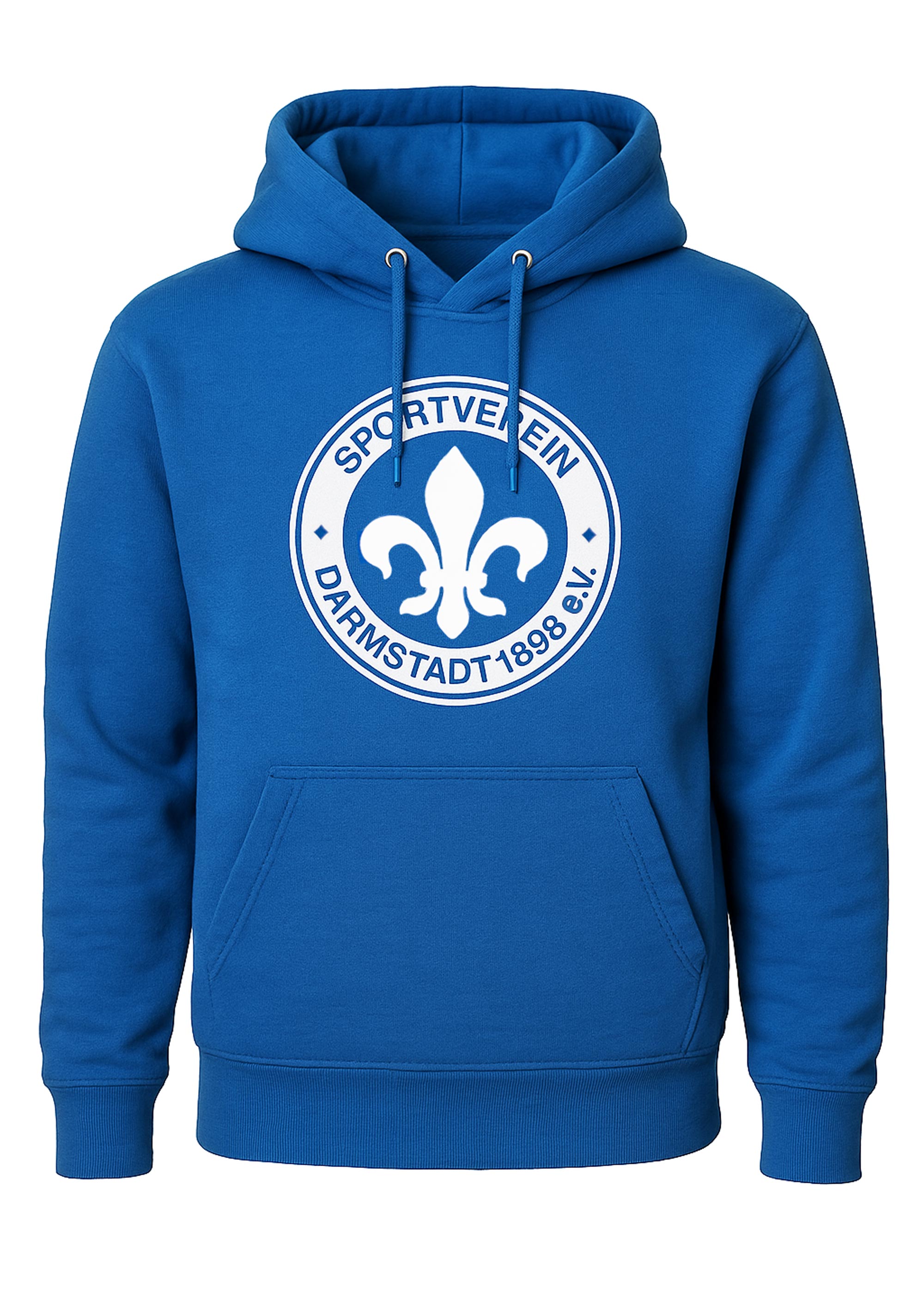 Royalblauer Kapuzenpullover mit Bauchtaschen und aufgedrucktem Vereinslogo.