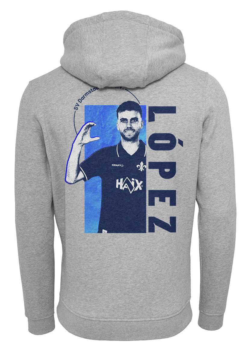 Das moderne Design vereint sportlichen Look und klare Linien: Auf der Vorderseite findest du die Rückennummer und Unterschrift des Spielers, auf der Rückseite den großflächigen Spielerprint in den Vereinsfarben Blau und Weiß. Der dezente Schriftzug „SV Darmstadt 1898 e. V.“ rundet den Hoodie gekonnt ab.