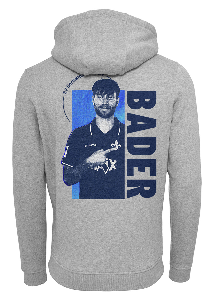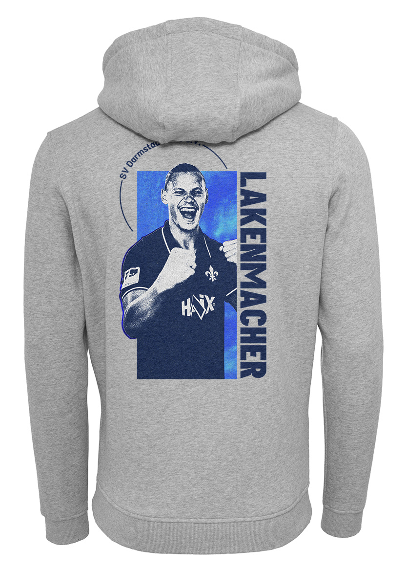 Das moderne Design vereint sportlichen Look und klare Linien: Auf der Vorderseite findest du die Rückennummer und Unterschrift des Spielers, auf der Rückseite den großflächigen Spielerprint in den Vereinsfarben Blau und Weiß. Der dezente Schriftzug „SV Darmstadt 1898 e. V.“ rundet den Hoodie gekonnt ab.