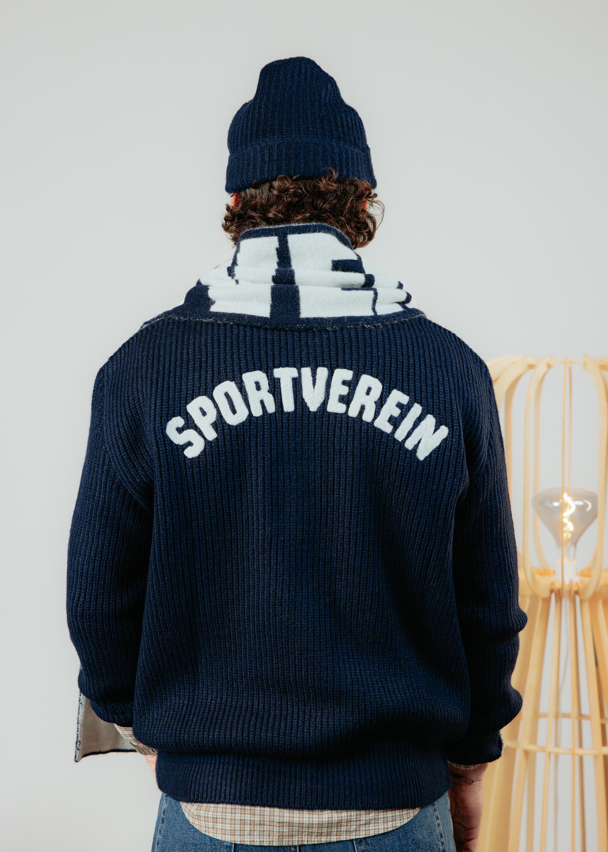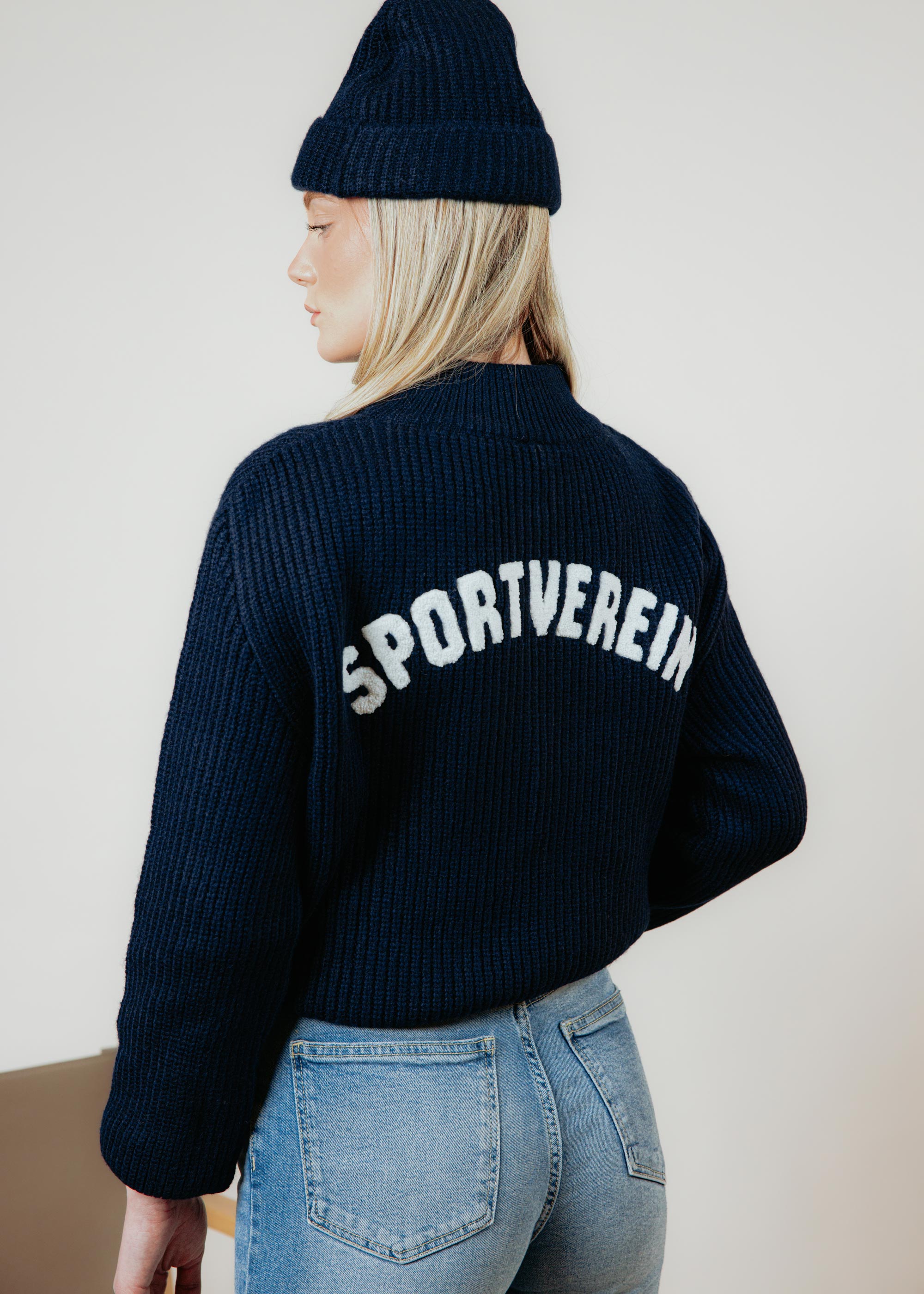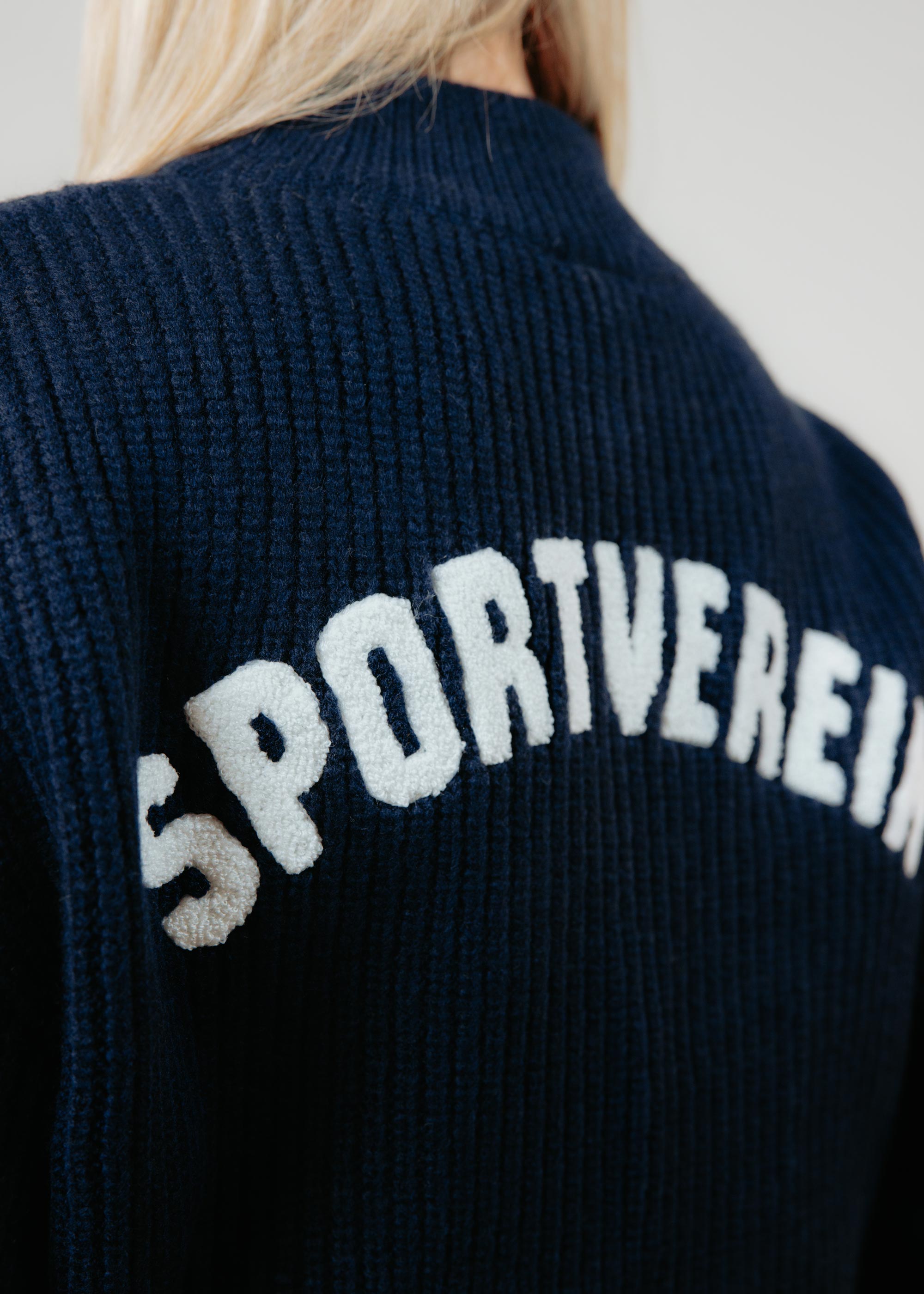 Auf der Brust ist eine gestickte Lilie platziert, auf dem Rücken der Schriftzug „Sportverein“. Der Navy-Farbton verleiht dem Pullover eine ruhige, hochwertige Optik und macht ihn vielseitig kombinierbar – ideal für kühlere Tage.