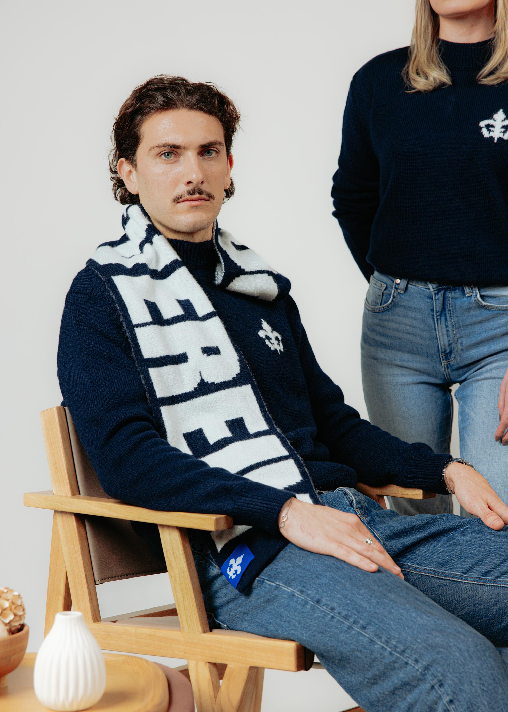 Auf der Brust ist eine gestickte Lilie platziert. Der Navy-Farbton unterstreicht die ruhige, hochwertige Optik und lässt sich vielseitig kombinieren.