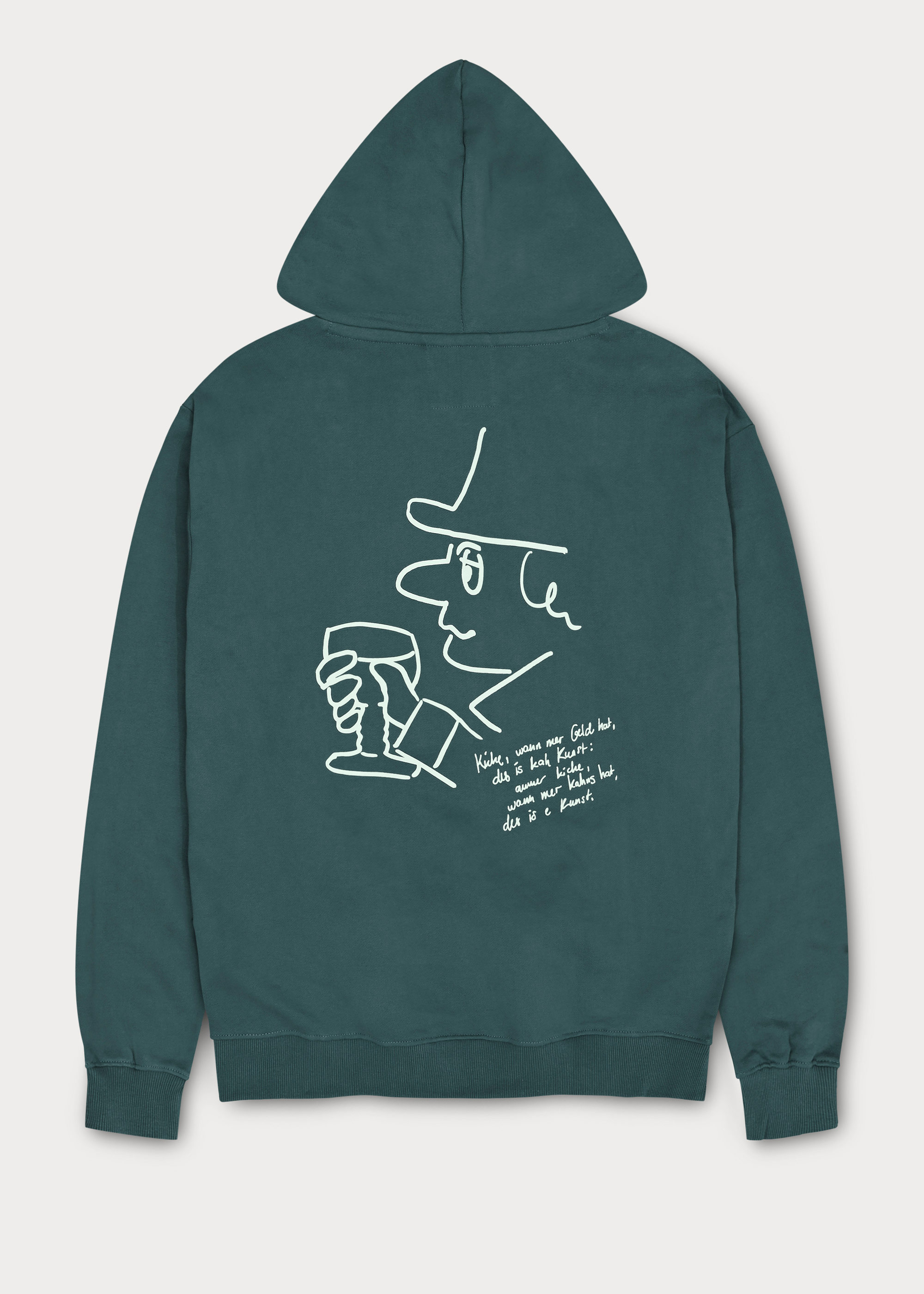 Türkisener Unisex-Hoodie mit dezentem Pocketprint auf der Vorderseite und großem Datterich-Print auf der Rückseite.