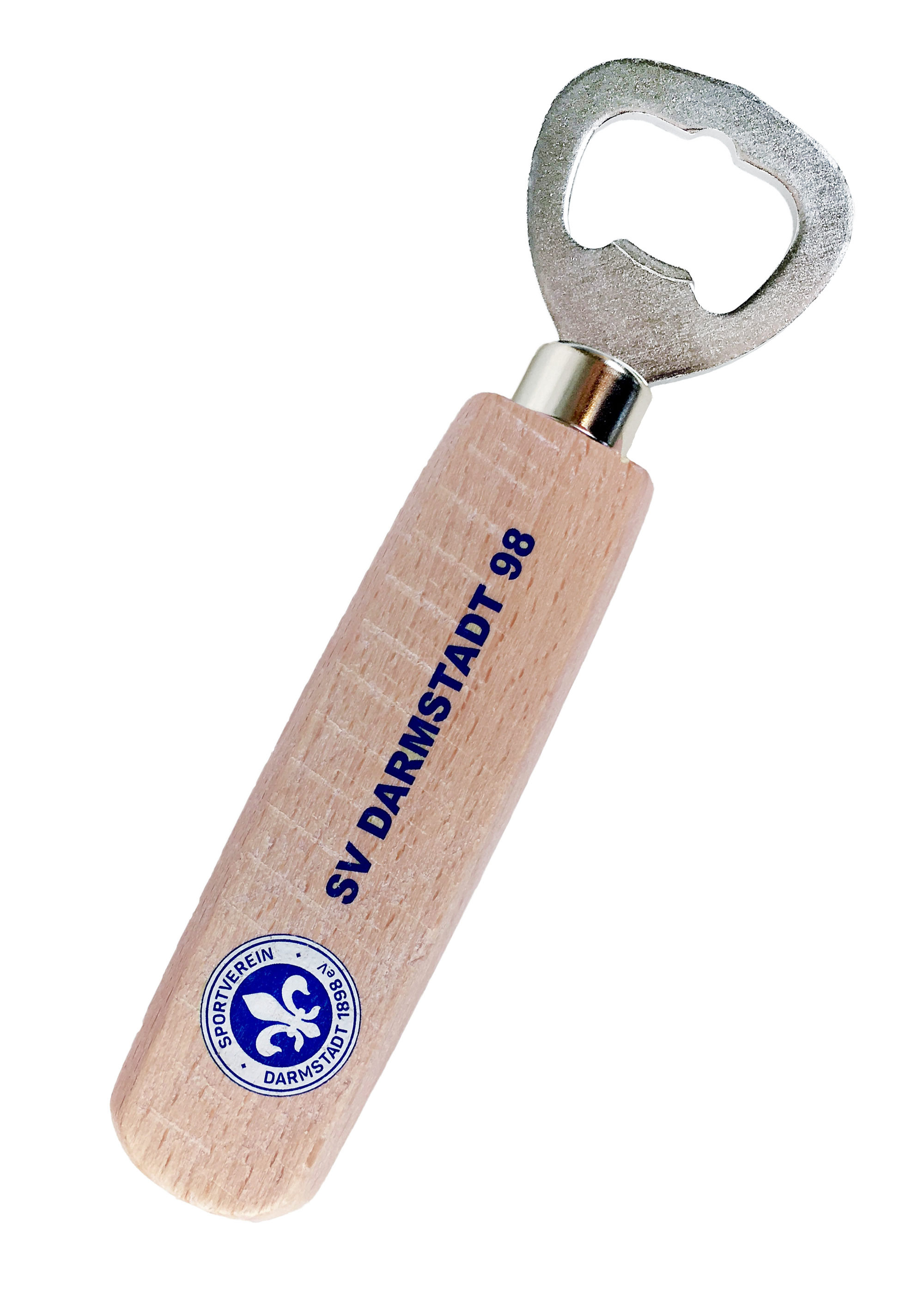 Klassischer Flaschenöffner mit Holzgriff und aufgedrucktem "SV Darmstadt 98"-Schriftzug und Logo.